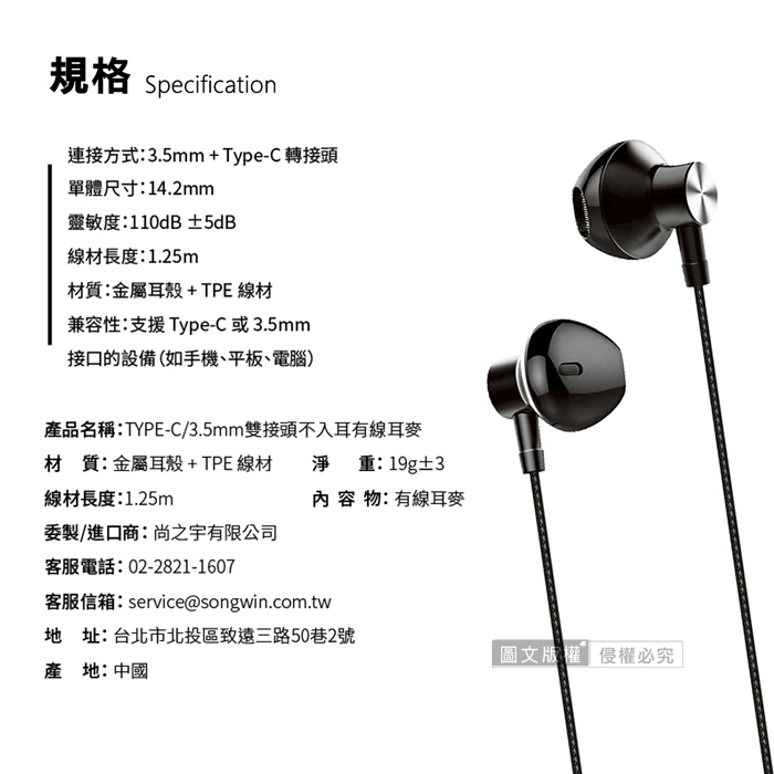 | 商品名稱 | 【Songwin】超值兩用款 Type-C/3.5mm 雙接頭不入耳線控耳機 |