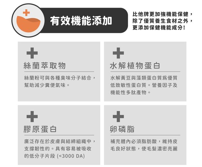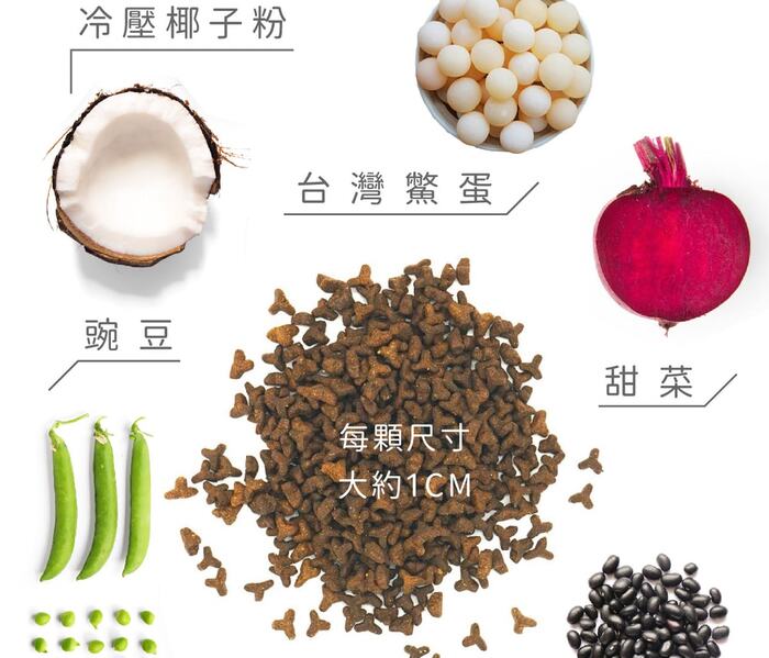 | 內容物 (完整成份/食品添加物) | 澳洲雞肉粉、水解植物蛋白、雞肉水解蛋白、糖蜜酵母、木薯、黃金亞麻仁籽、冷壓椰子粉、雞油、深海魚油(OMEGA-3、OMEGA-6來源)、絲蘭萃取物、甜菜、苜蓿、蔓越莓、藍莓、草莓、覆盆子莓、乾燥蛋黃、青仁黑豆、豌豆、大麥若葉、台灣紅藜、保健機能粉(鱉蛋粉、膠原蛋白)、腸道保健益生菌、蔓越莓萃取物、卵磷脂、維生素(A、D、E、K、1(硫胺素)、B2(核黃素)、B6(吡哆素)、B12(鈷胺素)、葉酸、泛酸、菸鹼酸、生物素)、礦物質(硫酸鋅、硫酸銅、硫酸錳、硫酸鐵、碳酸鈷、碘化鉀)、牛磺酸、氣化膽鹼、DL-蛋胺酸、離胺酸 |