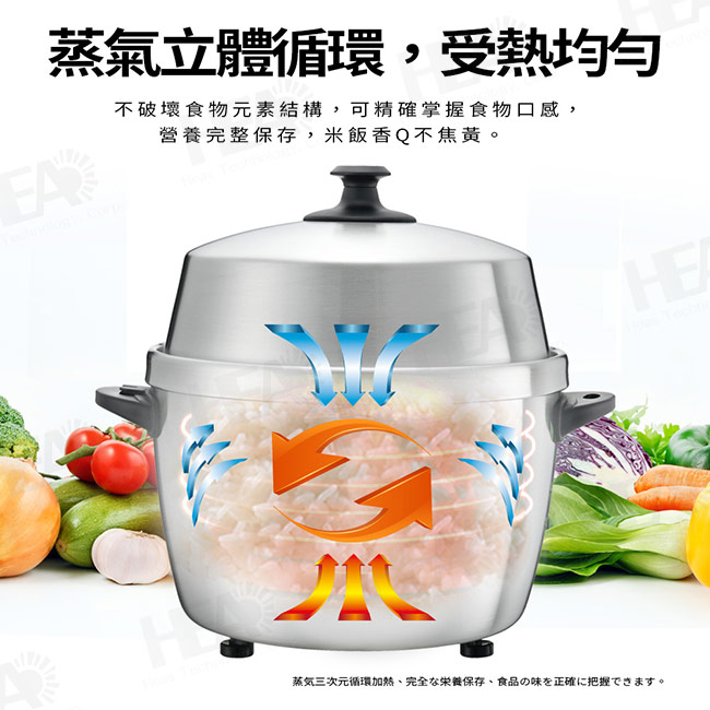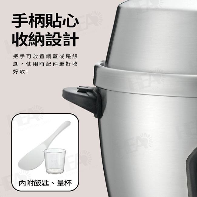 | 材質 | 高蓋-#316不鏽鋼/中鍋-#316不鏽鋼/內鍋-#316不鏽鋼/外殼-304不鏽鋼/蒸架-304不鏽鋼/飯匙-食品級耐熱P.P./計量杯-食品級耐熱P.P. |