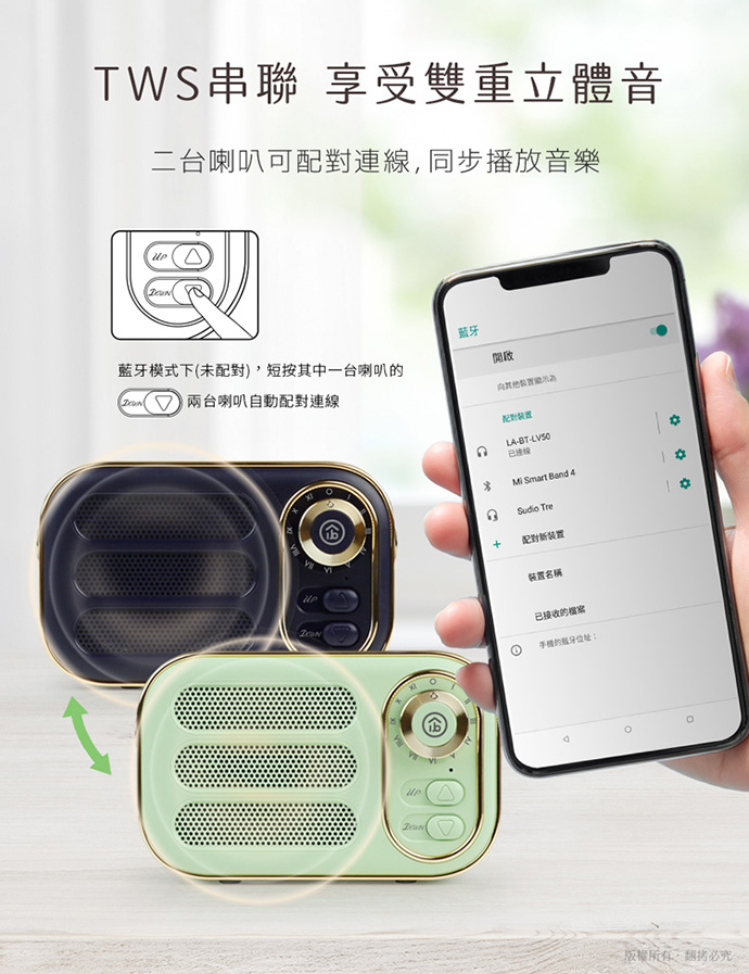 ※TWS無線串聯,需備配二台同款喇叭才可互相串聯!