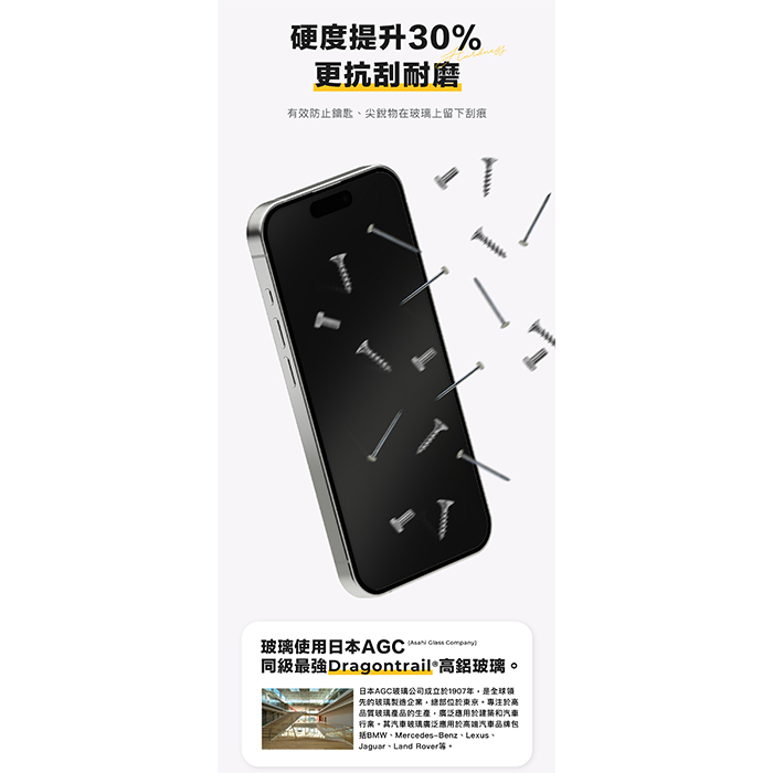 ◎ 採用日本AGC鋁矽強化玻璃,抗摔防刮,透光率極高